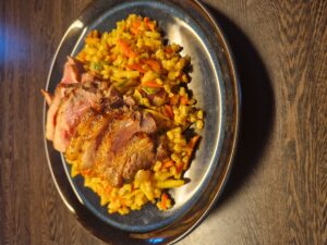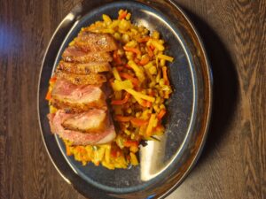 Steg det ønske kød du ønsker ( fisk, kylling, oksekød, lam , tufo, eller laks der også er krydret med all-round), vi har denne gang stegt andebryst der er krydret med salt og peber.